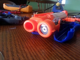 Another, better option might be to drill two small holes on that orange barrel, one directly to the left/right (depending on which way your laser is straying) and one below (or above, again, depends on what how your laser is off). Then put in a couple small screw, which you can then use to adjust and fine tune the sight. But realistically, this mod is overkill anyhow, it doesn't have to be dead on precise since the darts will start to stray in whatever direction they want after about 10 feet anyhow.