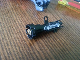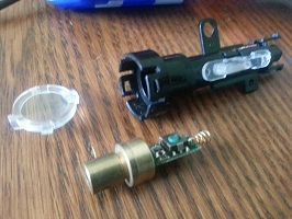 After all that it's just a matter of fitting it back together the way it was. Well that and getting the laser to line up. You can fit a little bit of something in between the black barrel tube and front of the laser module. However, to make mine fit better, I wrapped it in two layers of black electrical tape. By this point, I had already soldered it together so didn't have the option to do that. Instead I fit some wire in between the black barrel and one of two little clear plastic pieces that used to show light from the led on the side. I'll leave it to you to make it as necessary for you.