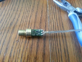 Getting the module out of the laser pointer barrel might be a bit of a pain if you don't have a dremel. That's what I used to just split it completely down the middle, allowing the module to slide right out. I don't recommend trying to force or twist it out as it's usually pressed in there pretty good, and you'll probably break the board that way.