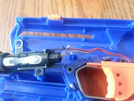 Now it's simply a matter of fitting the laser module in the tube, trimming the wires so they aren't sticking out too far, and soldering them to the existing trigger wires. Obviously pay attention to which is negative and positive and wire them up correctly (I THINK the red one was positve, but I'm not...positive...).