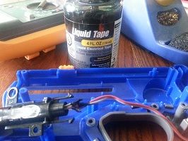 Next I put some liquid tape around the soldered connections to stop any shorting. You can use heat shrink tubing or black electrical tape if you like, but I like this stuff, it works great for smaller connections so you don't have to worry about the stiff bulkiness of heat shrink or tape when space is a premium.