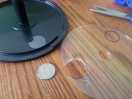 I wanted at least a little bit of protection for the laser module since the lens was now gone and it was exposed to the elements. I looked around and found a clear plastic disc that's used on the bottom of blank CD spindles. It was thin enough that you could cut it with scissors, yet still stiff enough to be useful. A nickel happened to be the perfect size for the template, I used a sharpie to trace and cut it out.