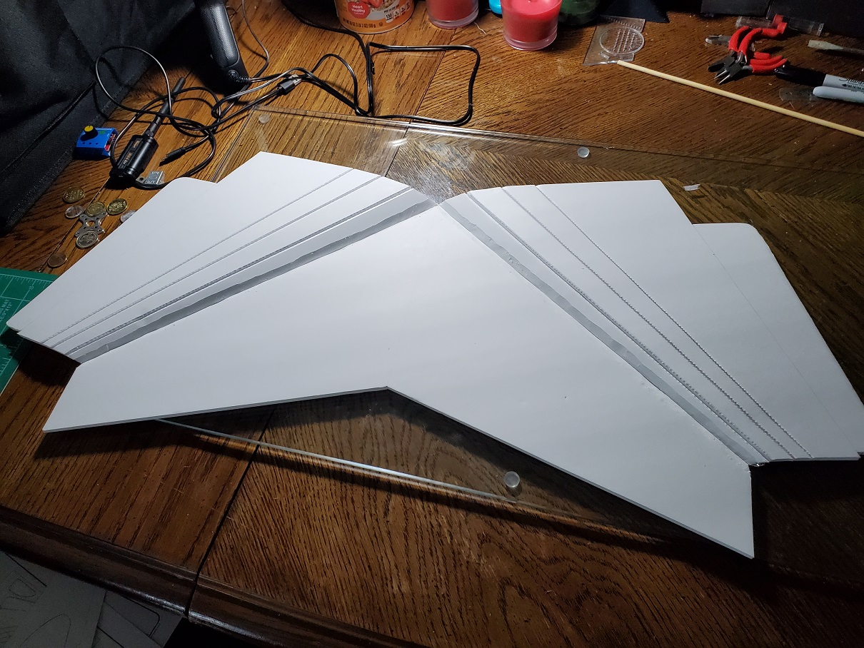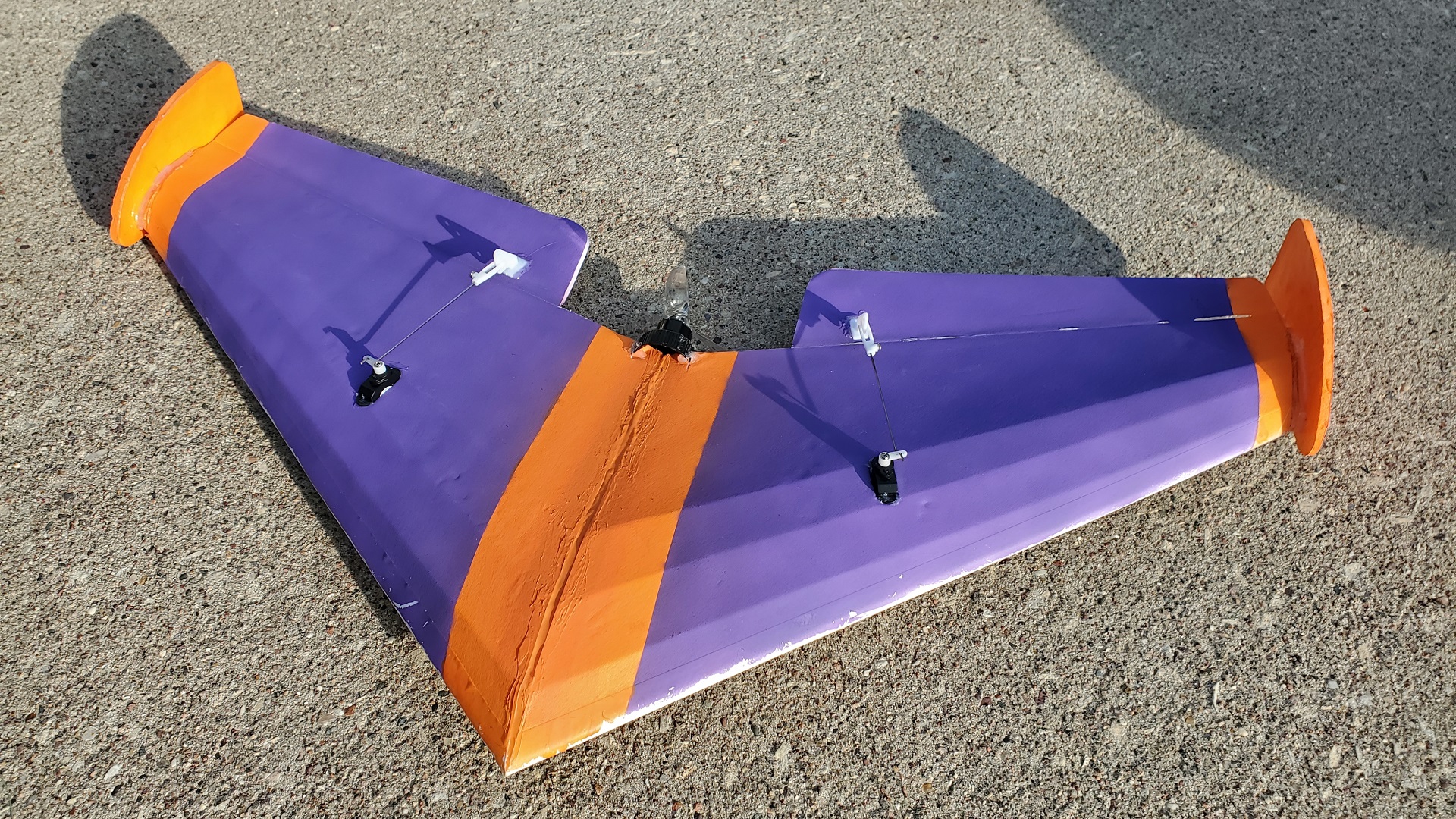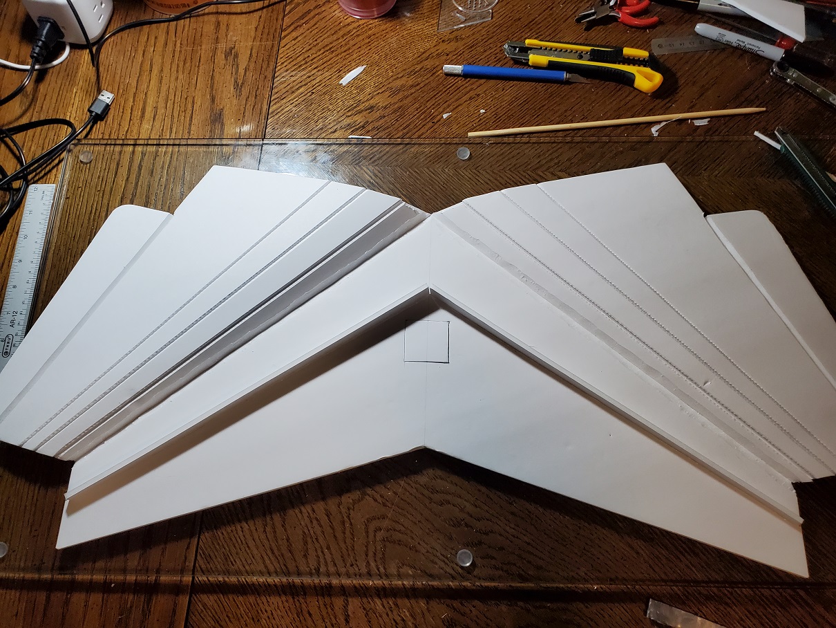 This is 22-inch wingspan flying wing made with the FT Slice plans as a guide, which itself is a scaled down version of the FT Mini Arrow (like the Crimson Chiroptera), but made with cardboard. Nice concept, but I wasn't going to waste my time making a plane from a greasy pizza box, so I decided to make it with foam board instead, with some adjustments.